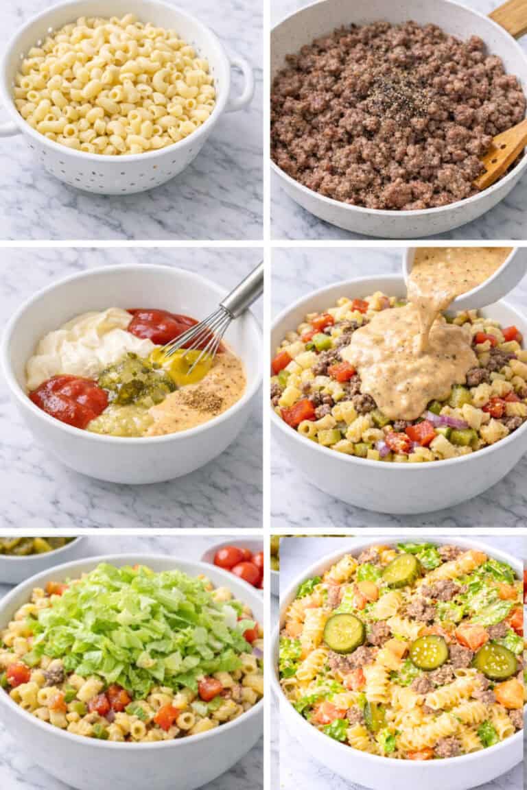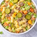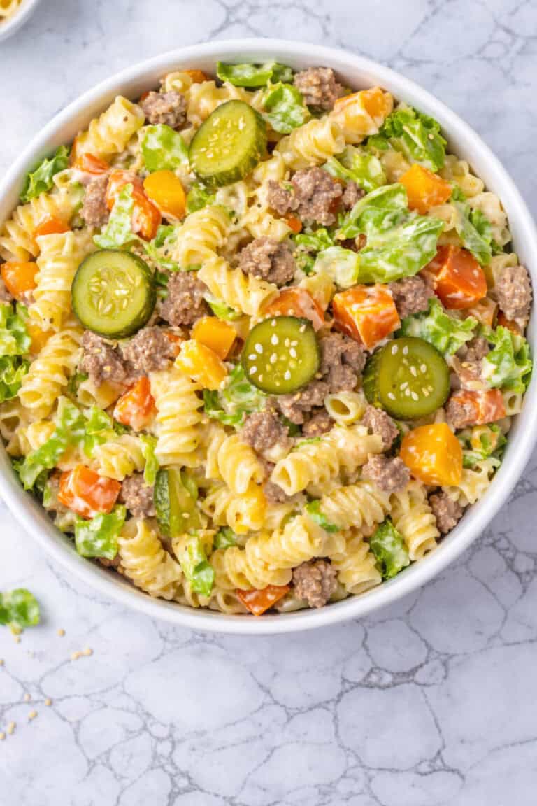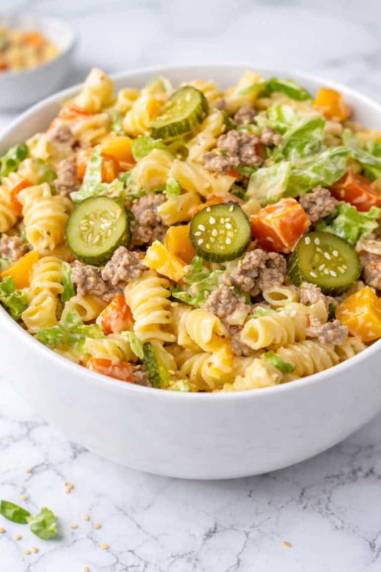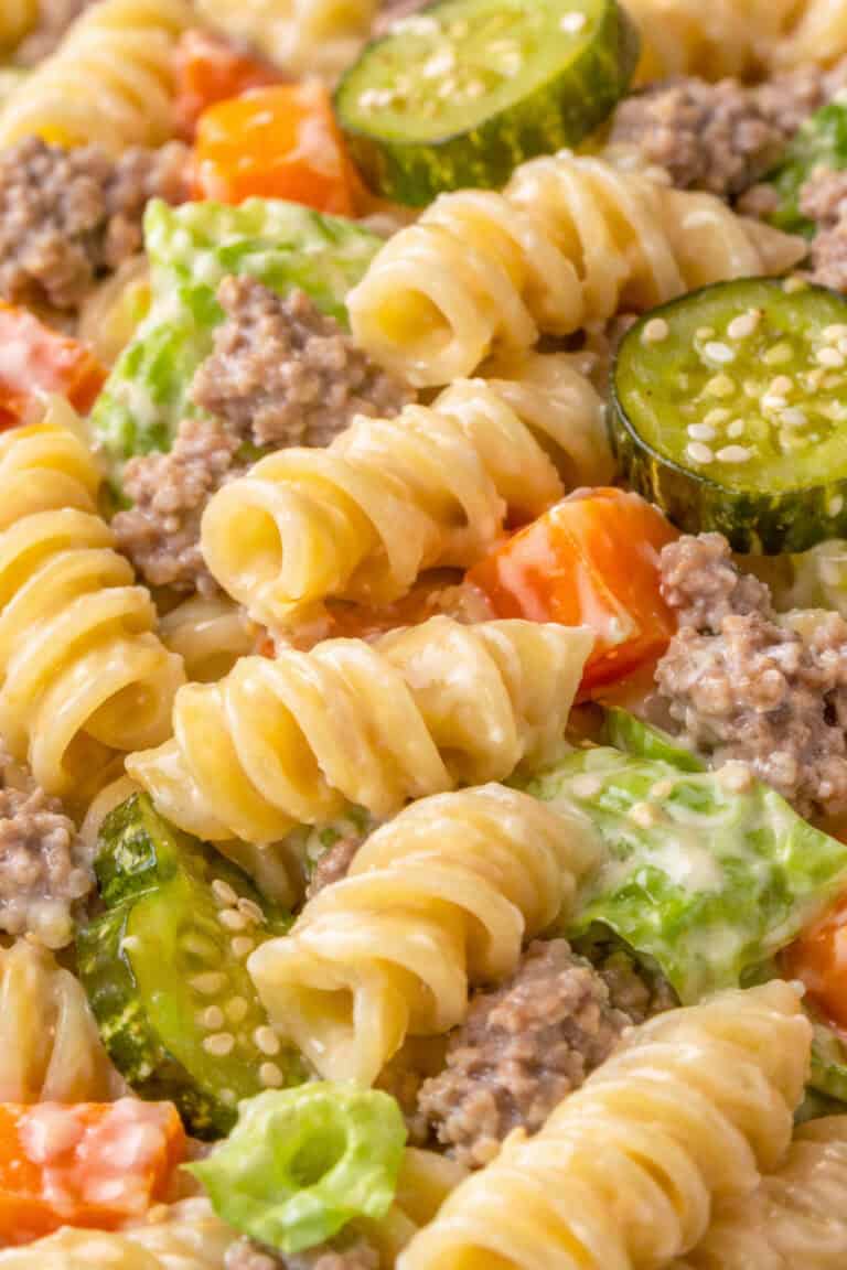 - In a large bowl, combine the cooled pasta, ground beef, cheddar cheese, pickles, red onion, and tomatoes. Pour the dressing over the top and gently toss until everything is evenly coated.