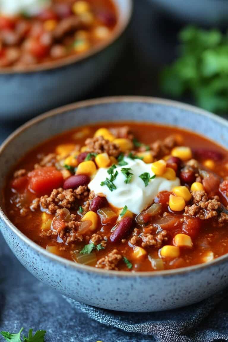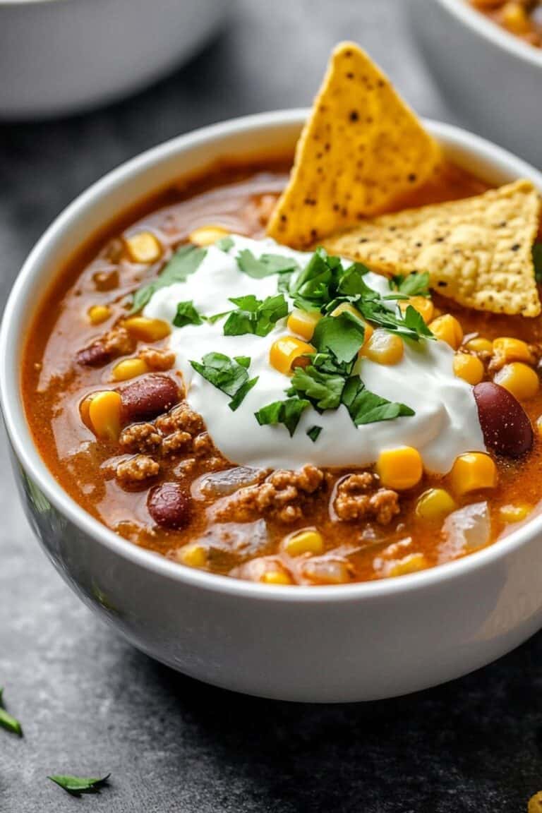 Stir in diced tomatoes, beans, corn, and beef broth, letting it simmer long enough for the flavors to settle together.