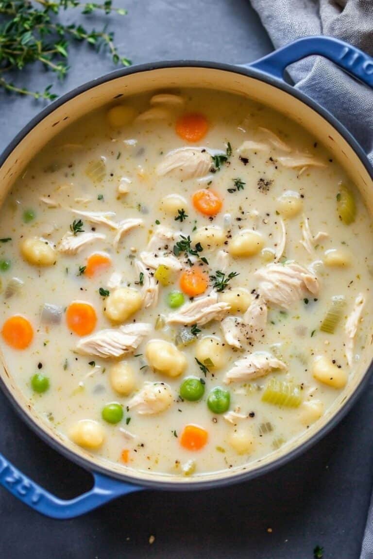 Add cooked chicken and gnocchi, letting everything simmer until the gnocchi float and turn tender.