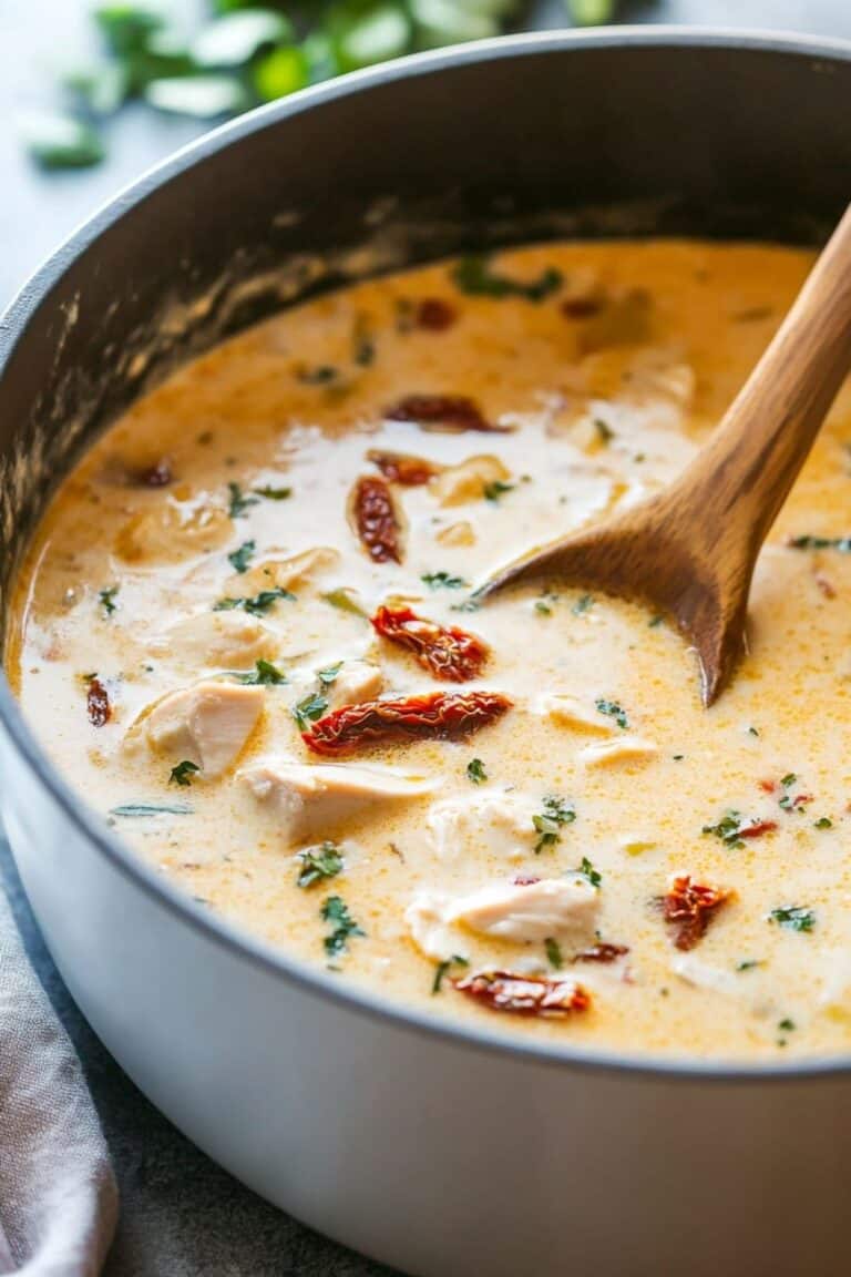 Add cooked chicken and sun dried tomatoes, then let everything bubble slowly so it gets rich without boiling too hard.