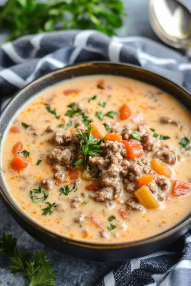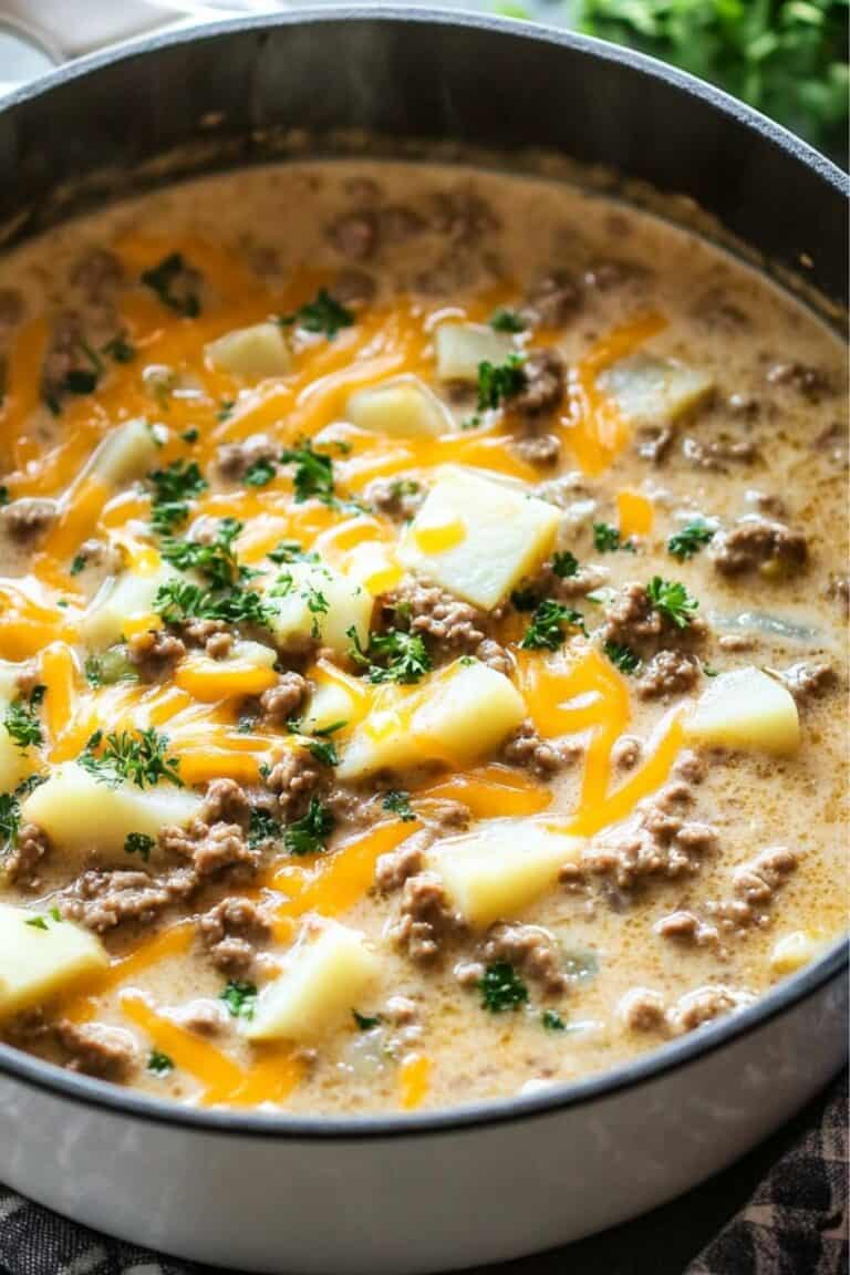 - Macaroni Cheeseburger Soup: Brown ground beef with onion, add broth and macaroni, then finish with milk and cheese once the pasta turns tender.