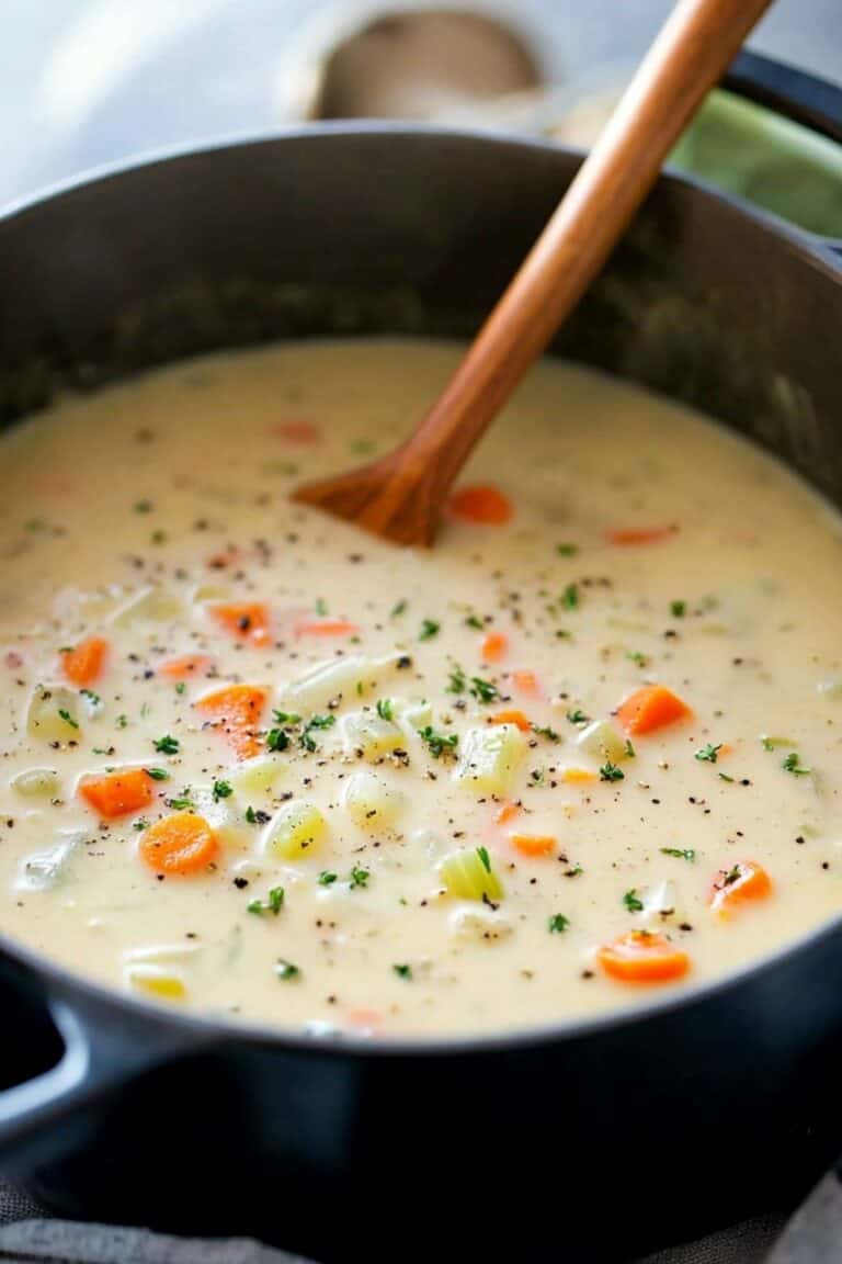 Let it simmer until the potatoes turn fork tender, then stir in milk or cream along with a scoop of cream cheese to thicken things up.