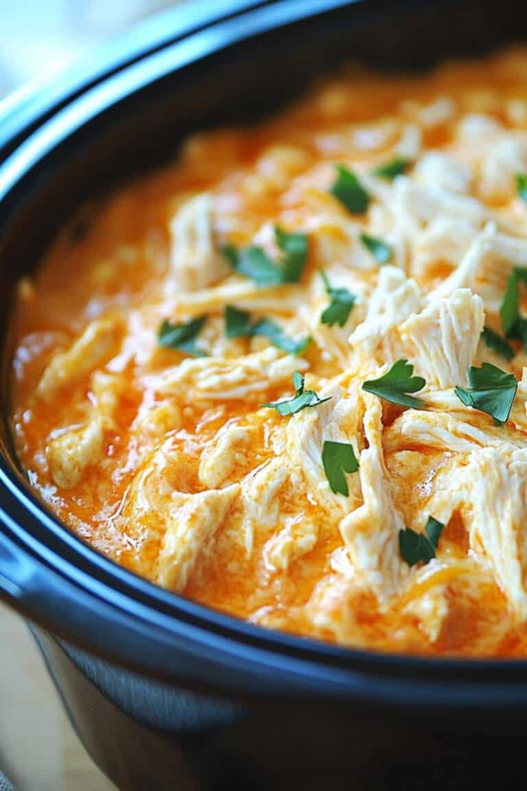 Toss the chicken, cream cheese, ranch, buffalo sauce, and both cheeses right into the crock pot.