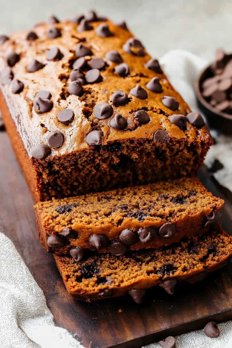 Fold in a generous amount of chocolate chips before pouring into a loaf pan.