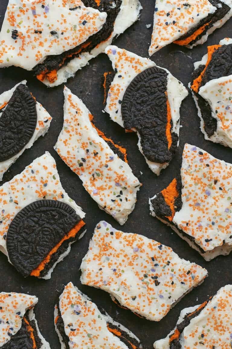 If you want a Halloween dessert that’s colorful, crunchy, and so easy to make, Oreo bark is the way to go.