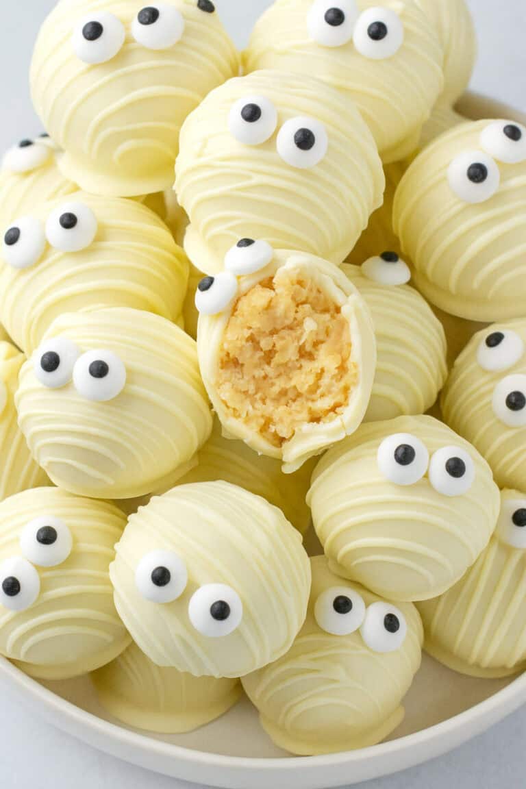 Place them on a parchment-lined baking sheet and refrigerate for 10–15 minutes to set. Finish by piping on spooky little eyes and mouths with black icing or melted black wafers.