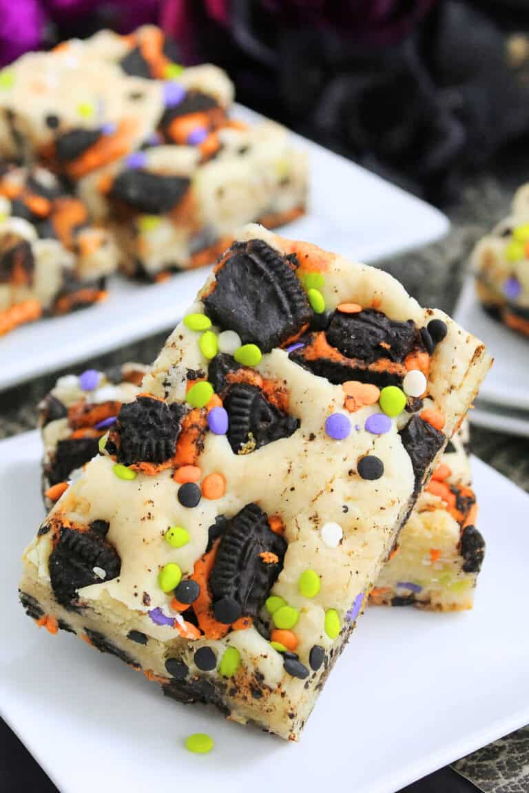 Let the bars cool completely before cutting them into squares, then serve and enjoy these soft, festive Halloween Oreo cake bars.