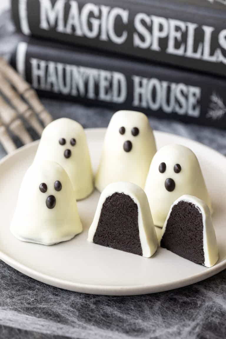 Just coat each Oreo in white chocolate or vanilla candy melts and make sure to use a Ghost cookie mold, then use a small amount of dark chocolate (or melted candy melts) to pipe on spooky eyes and a little mouth.
