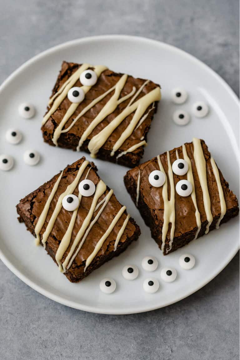 Melt white chocolate, attach candy eyes, and drizzle the rest over each brownie to create fun mummy “bandages.”