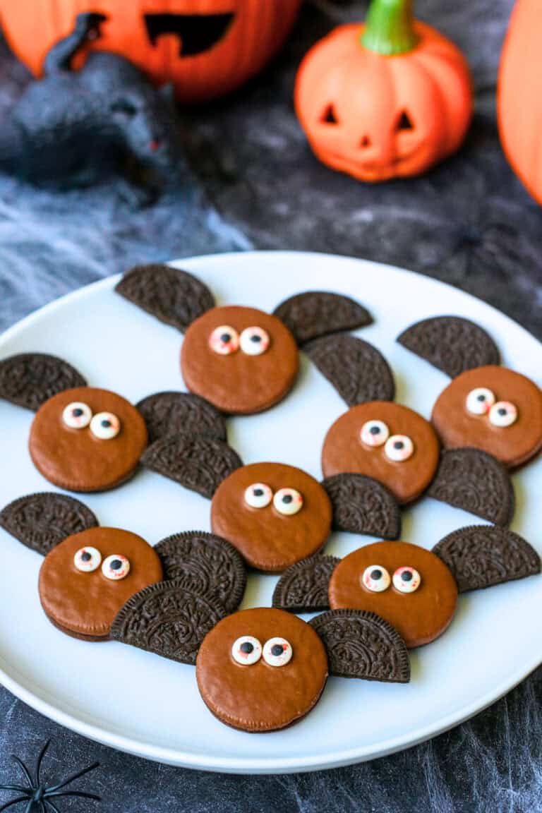 Then, tuck the wings into the cream on each side, chill for a few minutes, and you’ve got the most adorable little bats ready to swoop onto your Halloween dessert table.