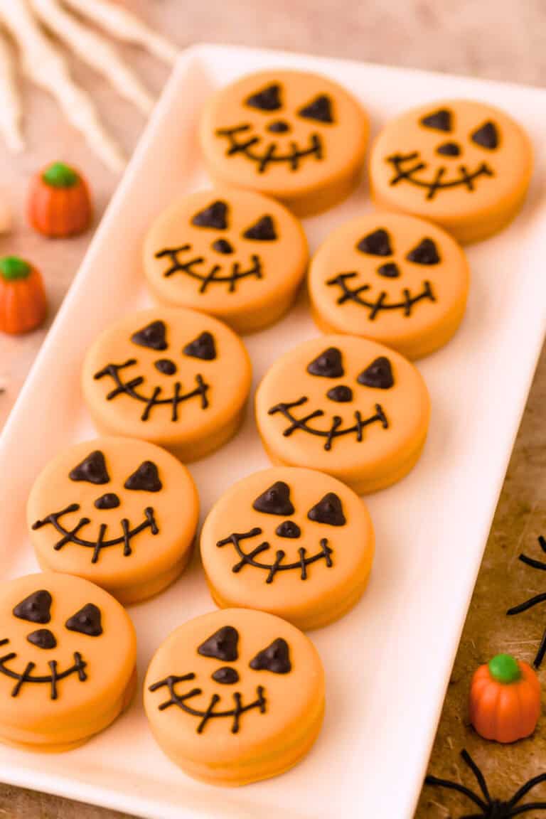 You just dip each Oreo into orange melted candy melts or chocolate, then decorate with candy eyes, drizzles, or sprinkles while the coating is still soft to make a spooky pumpkin face.