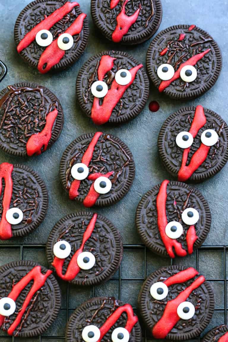 You just grab plain Oreos, splatter red icing across them to mimic spooky “blood,” and stick on candy eyes (sometimes one, sometimes two) for a creepy effect.