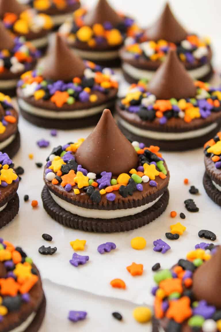 Just dip Oreos in melted chocolate, press a Hershey’s Kiss on top for the hat, and add a little frosting ribbon or sprinkle band for flair — then chill until set for the sweetest spooky snack.