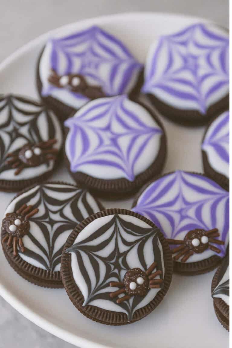 Just drizzle melted white chocolate in circles over each Oreo, drag a toothpick through the lines to create a web pattern, and let them set.