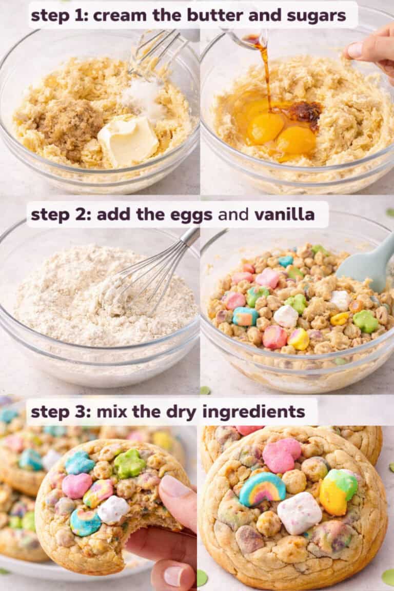 - You gently fold in the Lucky Charms cereal. I like to crush the cereal slightly but keep the marshmallows mostly whole so they stay cute after baking.