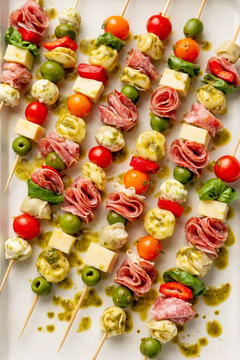 To assemble, thread the tortellini, olives, tomatoes, meats, cheeses, basil, artichokes, and roasted red peppers onto the skewers in any order you like. Arrange the skewers on a serving platter and drizzle lightly with extra dressing just before serving.