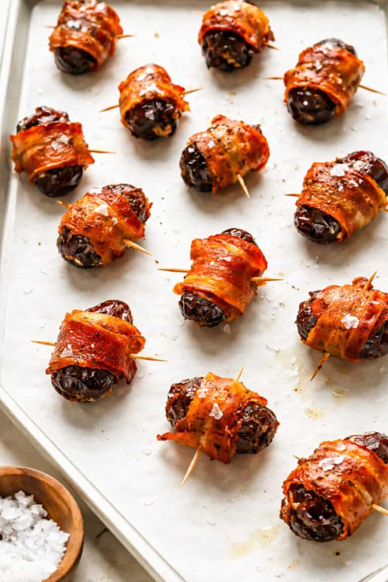 Wrap each date with half a strip of bacon and secure with a toothpick. Place on a lined baking sheet and bake at 400°F for 18–22 minutes, flipping halfway. Let cool slightly before serving.