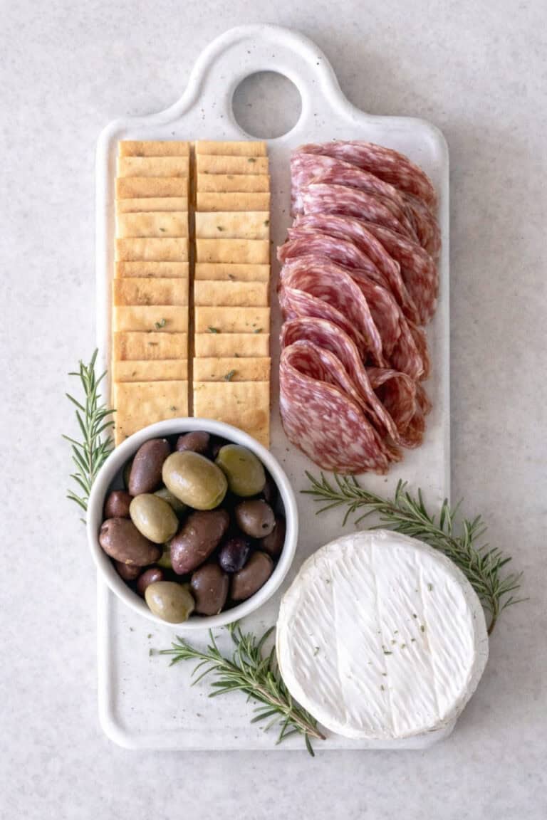 Add a small bowl of olives below the crackers and place the wheel of brie on the bottom-right, leaving a little breathing room so each item feels intentional.