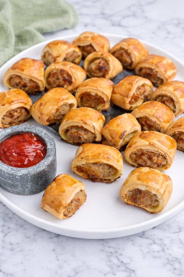 Wrap sausage in pastry and cut into bite-sized pieces. Bake at 400°F for 20–25 minutes until golden. Cool slightly before serving.