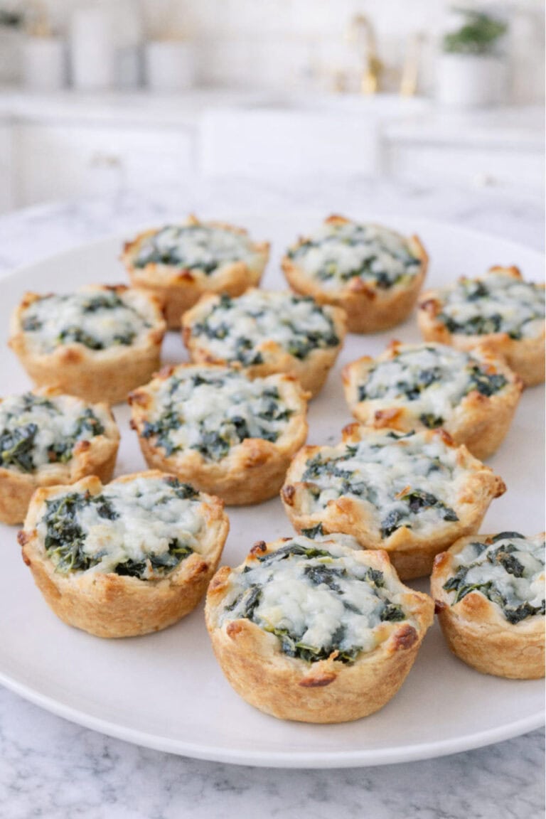 Lightly grease a mini muffin tin, press one dough square into each cup, add a teaspoon of the spinach mixture, and top with the remaining mozzarella. Bake for 15–17 minutes until golden, then let cool for a few minutes before serving.