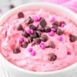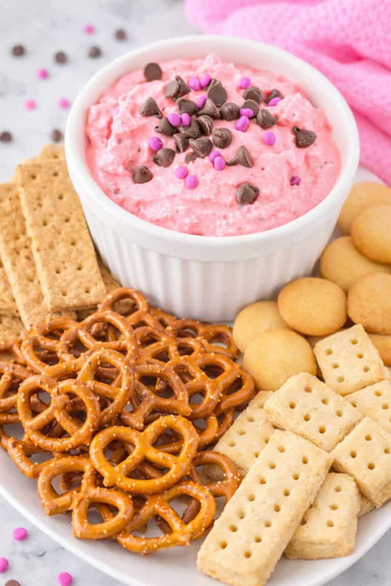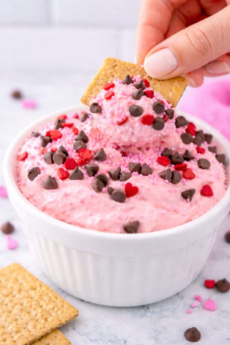 Scoop the dip into a serving bowl and sprinkle the remaining chocolate chips and sprinkles over the top.
