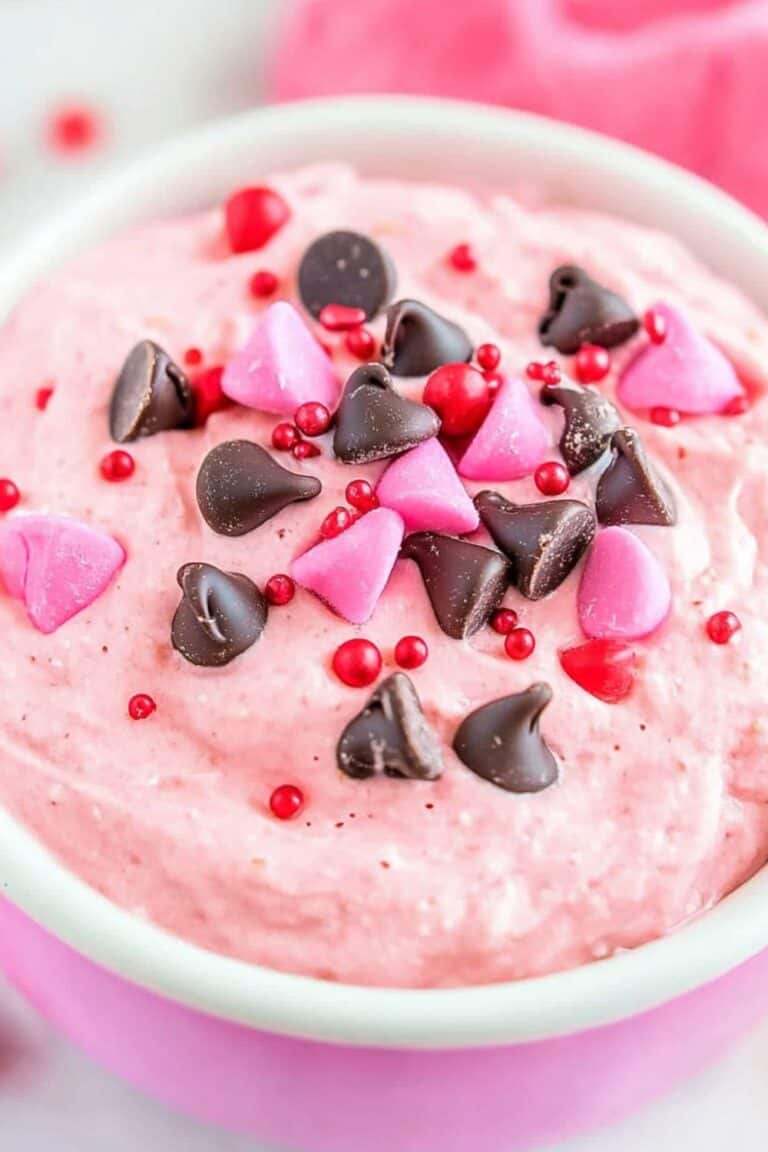 - Transfer the dip to a serving bowl and top with the remaining chocolate chips and sprinkles.