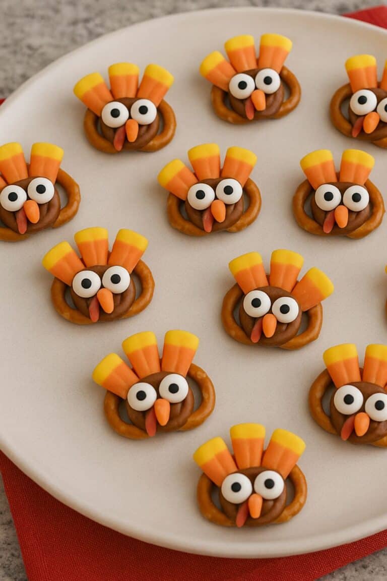 Bake for just a couple minutes until the chocolate softens, then press candy corns into the top to make the feathers.