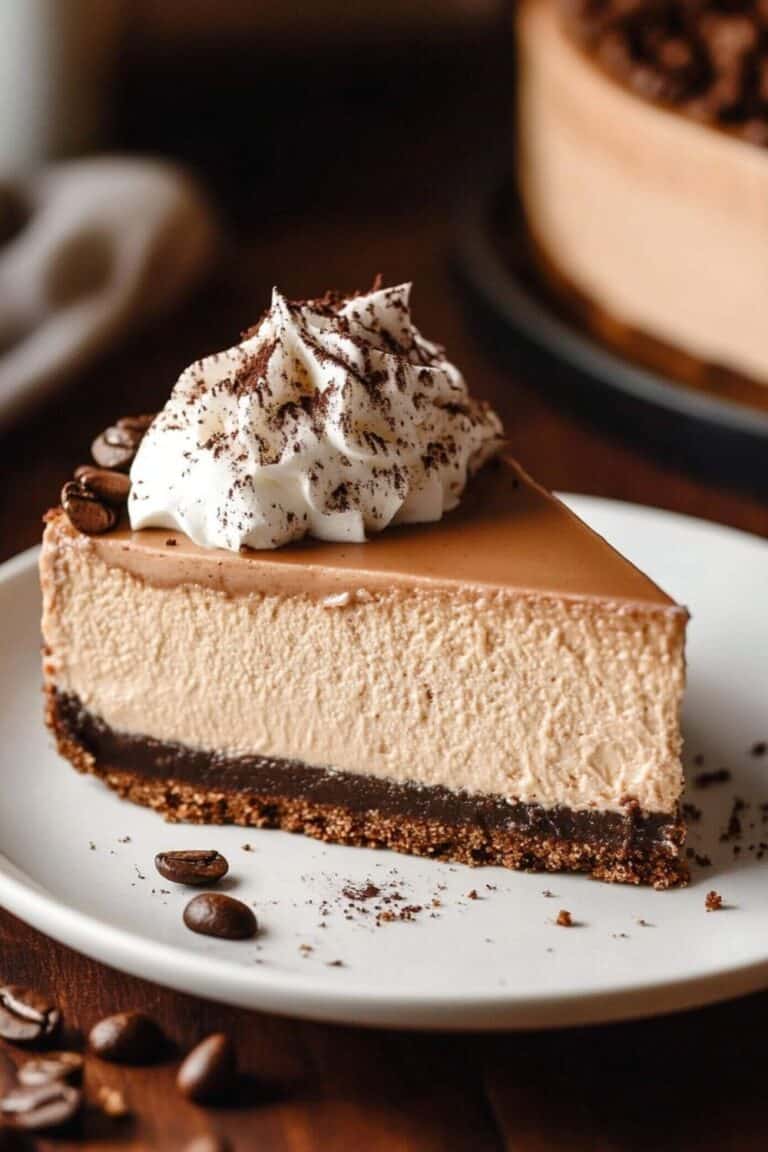 The crust is usually chocolate cookies for a mocha effect, though a plain graham cracker base also works well.