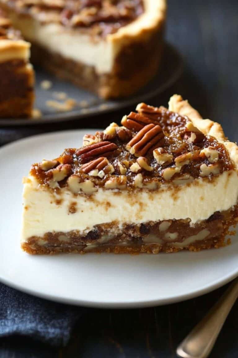 A graham cracker crust holds a creamy pecan pie cheesecake filling that bakes low and slow.