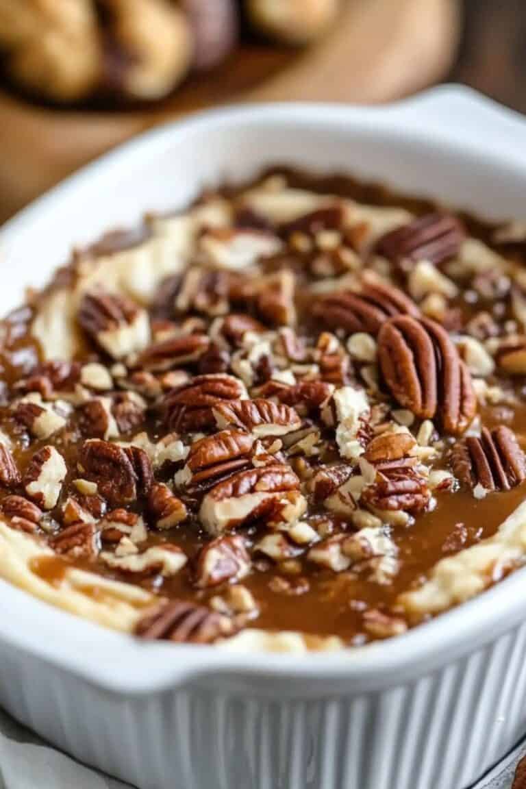 Pecan pie dip is best served with graham crackers, apple slices, or vanilla wafers for scooping.