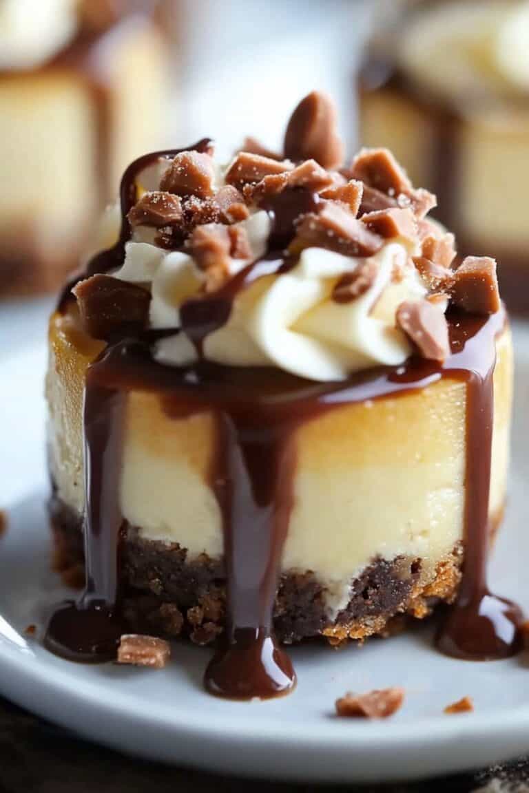 Top each mini with caramel sauce, a drizzle of melted chocolate, and chopped pecans.